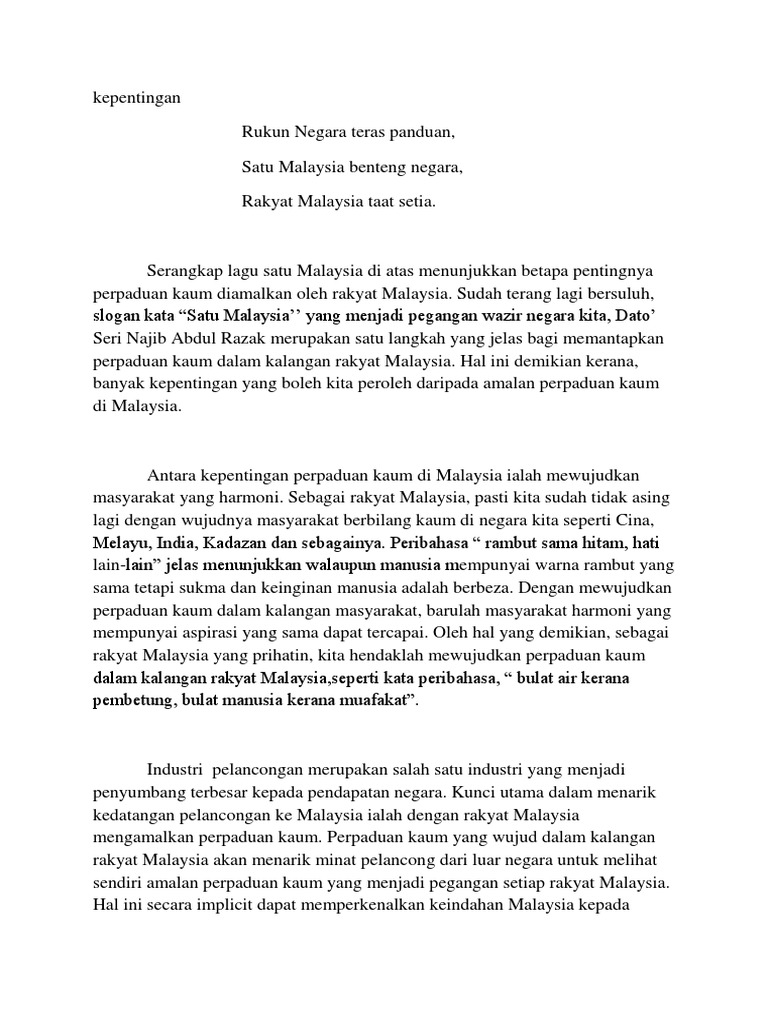 Perpaduan kaum di negara kita.di iktiraf dunia.!!! Contoh soalan dan skema jawapan pengukuhan negara dan bangsa malaysia. Sejak merdeka lagi, kerajaan telah memupuk semangat perpaduan dalam memakmurkan negara kita. Perpaduan dapat mewujudkan kestabilan politik dan sosial. Sebuah negara demokrasi sangat membutuhkan hukum mutlak karena prinsip negara demokrasi adalah kebebasan rakyatnya untuk bersuara dan memiliki hak yang sama satu dengan yang lainnya.