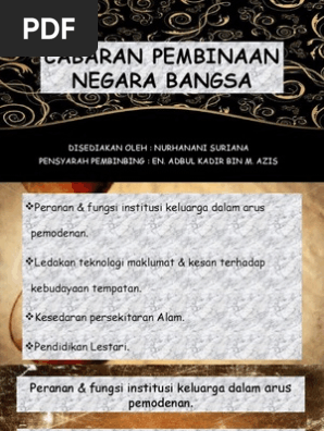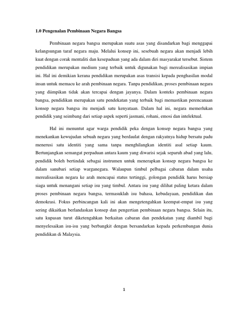 Pembinaan negara bangsa merupakan matlamat utama bagi sesebuah negara dan boleh dianggap sebagai kemuncak kejayaan bagi sesebuah negara, pentadbiran serta rakyatnya. Keupayaan membina negara bangsa bergantung kepada perkongsian nilai serta semangat patriotisme. Kenegaraan hns 2013 ahli kumpulan 78 nur suziana binti abdullah 67364 83 nur syafiqah nadhirah binti mohd aza 67369 89 norakma binti abdullah 67375 93 wan rosilawati binti w kamarudin 67379 94 nur fadilah binti pathull arifin 67380 95 noor syuhada binti mohd noor 67381. Kesukaran kepada pihak kerajaan untuk menyatukan kesemua kebudayaan yang ada untuk dilabelkan sebagai satu identiti. Pendidikan ketamadunan dirasakan amat penting untuk dijadikan sebagai sebahagian dari strategi bagi memupuk jati diri dan perasaan muhibah serta persefahaman di kalangan pelajar.