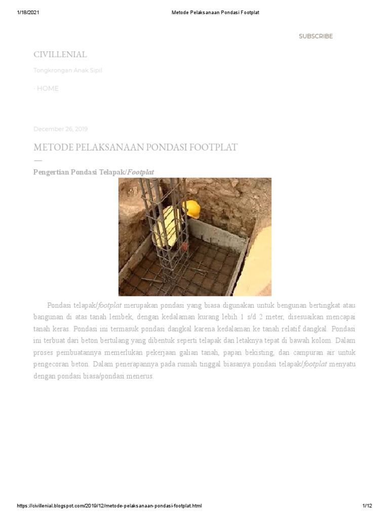 Metode Pelaksanaan Pondasi Foot Plat - Pondasi setempat (atau biasa disebut juga pondasi foot plat, pondasi telapak, atau pondasi tapak) pada umumnya digunakan untuk rumah 1 lantai, 2 lantai, 3 lantai, dan bahkan sanggup juga 4 lantai, jikalau dimensi tapak pondasi diperbesar dan tanah dasarnya cukup keras.. Galian tanah lebih sedikit (hanya pada kolom struktur saja). Cara menghitung jumlah besi pondasi setempat (pondasi foot plat). Pekerjaan lining dengan plat beton pra cetak ini dilakukan dengan lokasi dan tipikal sesuai dengan gambar desain. Metode pelaksanaan pekerjaan tanah cut and fill. Pembesian plat lantai beton jembatan juga menggunakan besi ulir dan dilaksanakan dengan sistem serempak untuk semua unit.